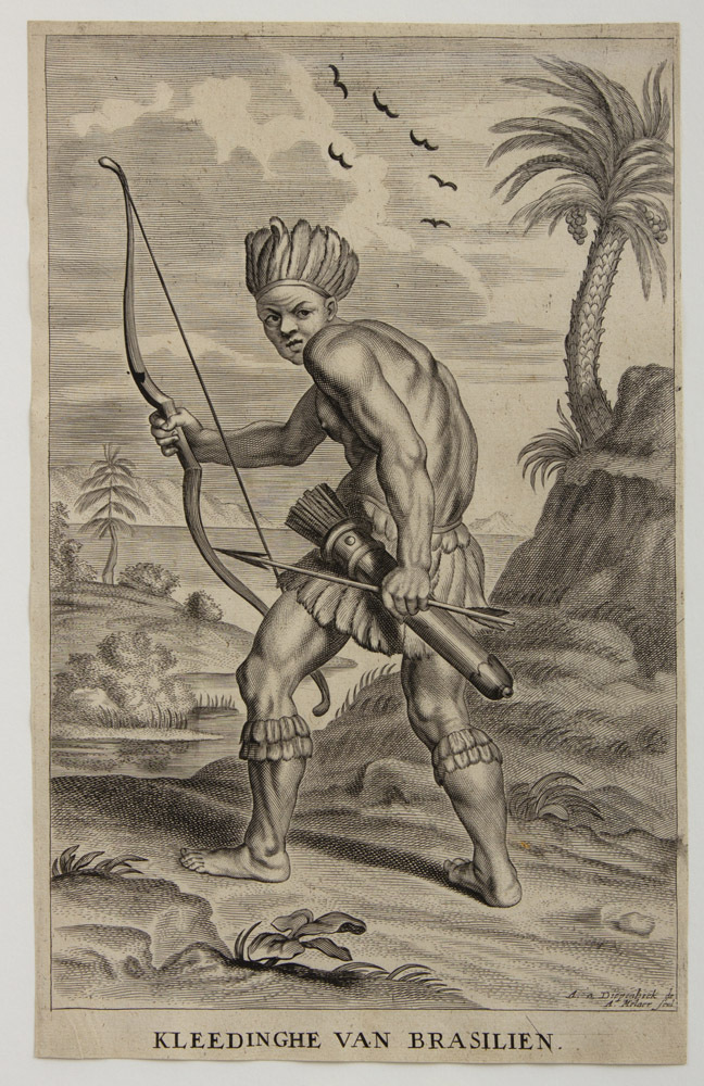 Afgebeeld is een indiaan, naar links gewend. Hij heeft een gekromde rug, op zijn hoofd een hoofdtooi van veren. Ook van veren is zijn lendekleding en de banden onder de knieƫn. In de rechterhand heeft hij een boog en in de linker een pijl. In een koker, die met een riem aan zijn middel is bevestigd, zitten nog een aantal pijlen. Rechts een heuvel met een palmboom, op de achtergrond een meer, aan de horizon omgeven door bergen.