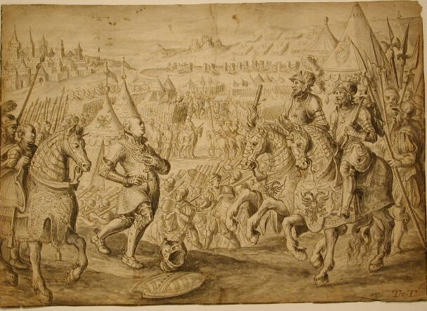 - BeschrijvingAfgebeeld is een militair kamp binnen aarden wallen. Links op de achtergrond een stad. Op de voorgrond een ontmoeting van ruiters in harnas. Links knielt een man ter overgave zijn helm en zijn schild liggen op de grond. De wapens en de schilden zijn nog niet geïdentificeerd.