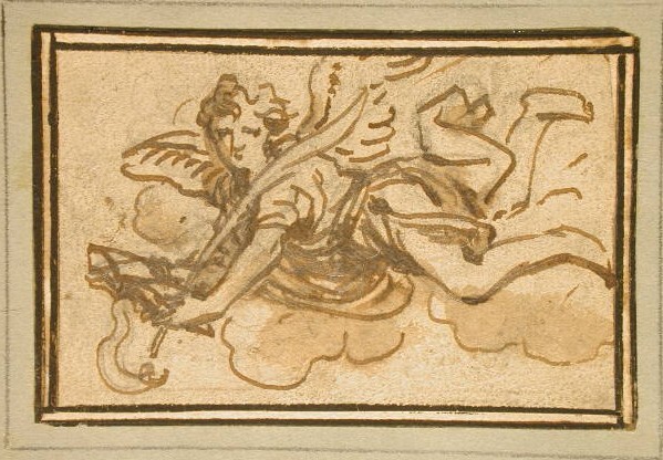 - BeschrijvingEen engel, zwevend op een wolk, houdt een boek en een palmtak in de hand. Het is en face getekend.