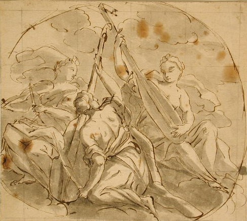 - BeschrijvingBinnen een ruw geschetst ovaal, zijn drie personen afgebeeld. Links een zittend persoon, die een grote luit bespeelt, rechts een met een viool en op de voorgrond een knielend persoon die een cello bespeelt. De tekening is d.m.v. potloodlijnen verdeeld in vierkantjes.