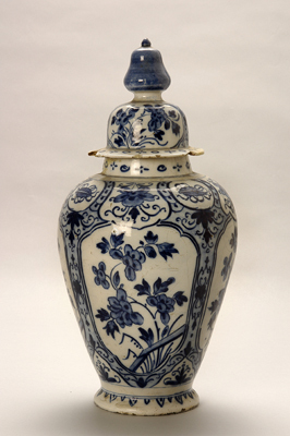 - BeschrijvingCanopisch model, klokvormig deksel met zware gedrongen peervormige knop. Vrij grove bloemdecoraties in cartoucheachtige omlijsting.