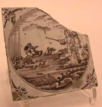 - BeschrijvingScherf van een bijbeltegel met een voorstelling van Mozes die de Rode Zee sluit, terwijl het leger van de farao verdrinkt.