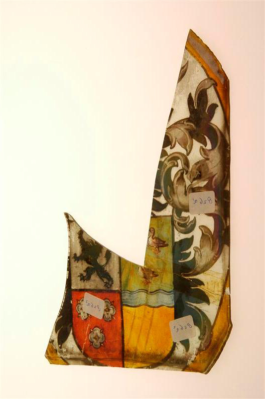 Drie fragmenten die tesamen een vrijwel compleet wapen vormen. Gedeeld, rechts doorsneden met een blauwe golvende faas, waarboven drie eenden op een groen veld, en waaronder een goud veld. Links: doorsneden, boven een zwarte leeuw op een zilver veld, onder drie witte rozen op een rood veld. De oorspr. ruit is ca 19 x 16 cm geweest, met afgeronde hoeken. Ca 2/3 resteert.