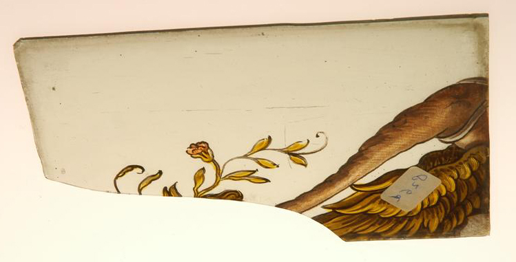 - BeschrijvingLinkerbovenhoek van een ovalen medaillon waarin zichtbaar een hand en een hangende tros met fruit, en gesteund aan de buitenzijde door een griffioen waarvan hier alleen de bovenzijde aanwezig is. Beide ruitjes zijn 14,2 x 9,2 cm doch van dit deel ontbreekt een hoek met de griffioenskop.