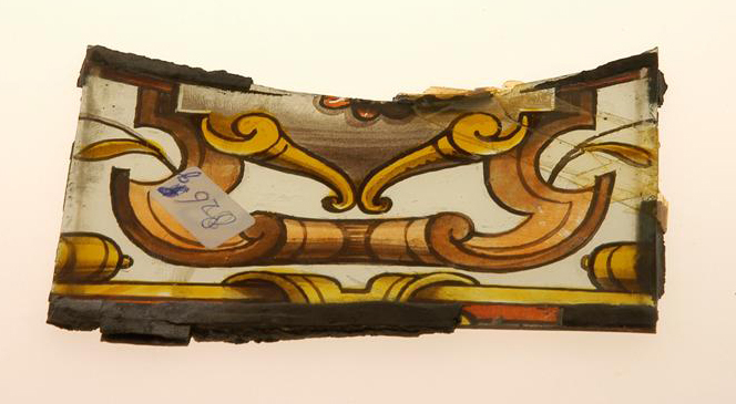- BeschrijvingRuitje van 6 x 9,2 cm met hol ovalen bovenrand en loodresten rondom, zijnde cartouche-achtige bekroning boven het ovalen medaillon, met een stukje bloem als in 00826.05.