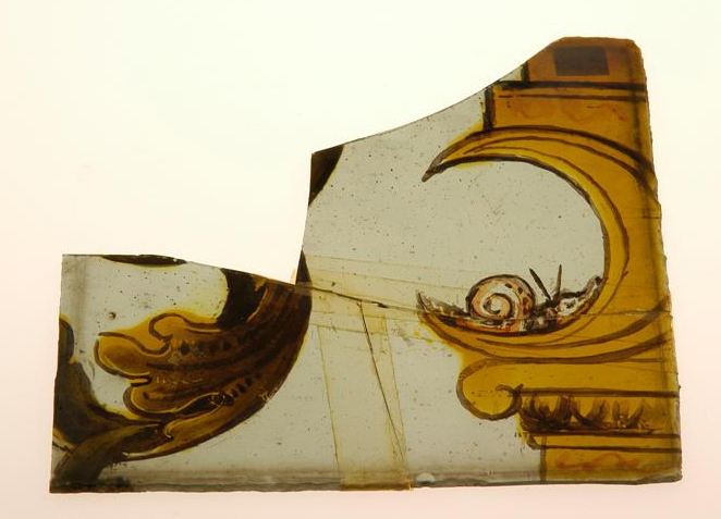 - BeschrijvingRechts: een zuilachtige rand in goud en rood met in het midden een maansikkel-achtig kapiteel, met slak. Links hiervan de ranken rond het wapen onder 827.0002 Ruitje in 3 stukken, vrijwel compleet, 11,4 x 12,8 cm