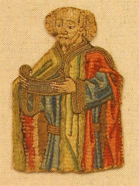 Nieuwtestamentisch persoon (waarschijnlijk apostel, evangelist of kerkvader) met banderol. In zijde geborduurd. De onderste helft van de figuur ontbreekt. Gezicht en handen in natuurlijke kleuren. Mantel in 2 tinten rood/rose en 3 tinten groen, kleed in 3 tinten blauw en bruin, gordel van gouddraad. Mantel en kleed afgezet met gouddraad. Banderol blauw met rode randjes, het geheel omrand met gouddraad.