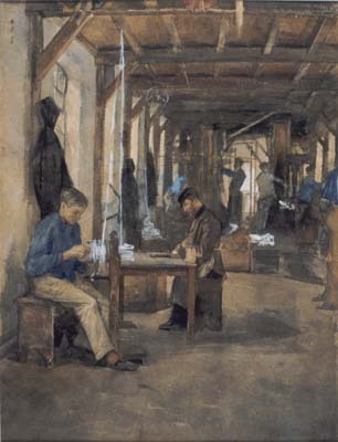 Arbeiders in de passementfabriek van Van der Veer aan de Orthenstraat te Den Bosch (garen, band, elastiek). Vervaardigd voor de eigenaar Jan van der Veer, met wie Derkinderen bevriend was.