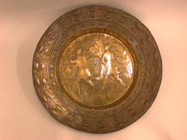 - BeschrijvingGeelkoperen collecteschaal, zeer dun, met in bodem gedreven voorstelling van de met de druiventros terugkerende verspieders. In rand o.a. 3 banden van opgedreven spitse amandelvormen.
