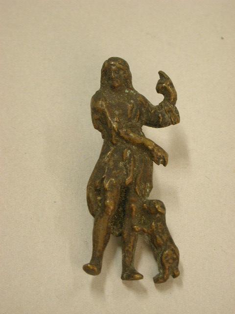 - BeschrijvingBronzen Rocchusbeeldje gekleed in heremietmantel met een hond tegen zijn linkerbeen.