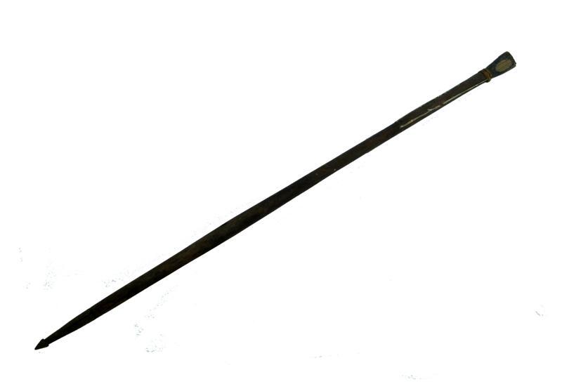 Houten pijl met 3 geheel afgesleten veren en vierkante ijzeren punt.