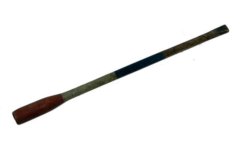Houten, rood-wit-blauw geverfde pijl met dikke brede kop en 3 - vrijwel geheel afgesleten- veren.