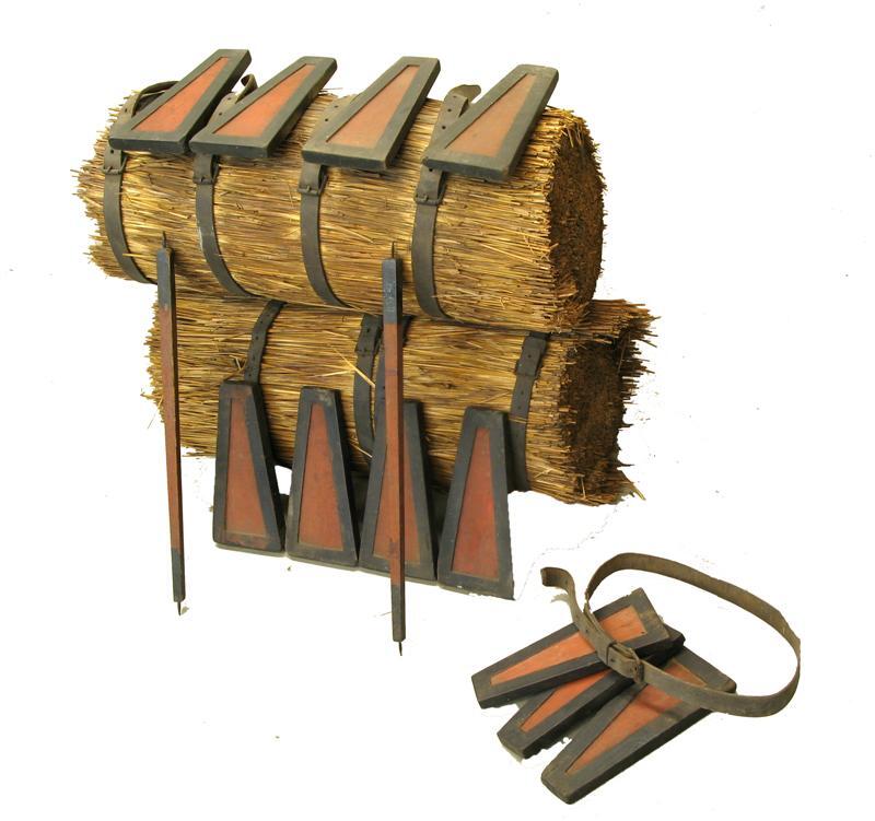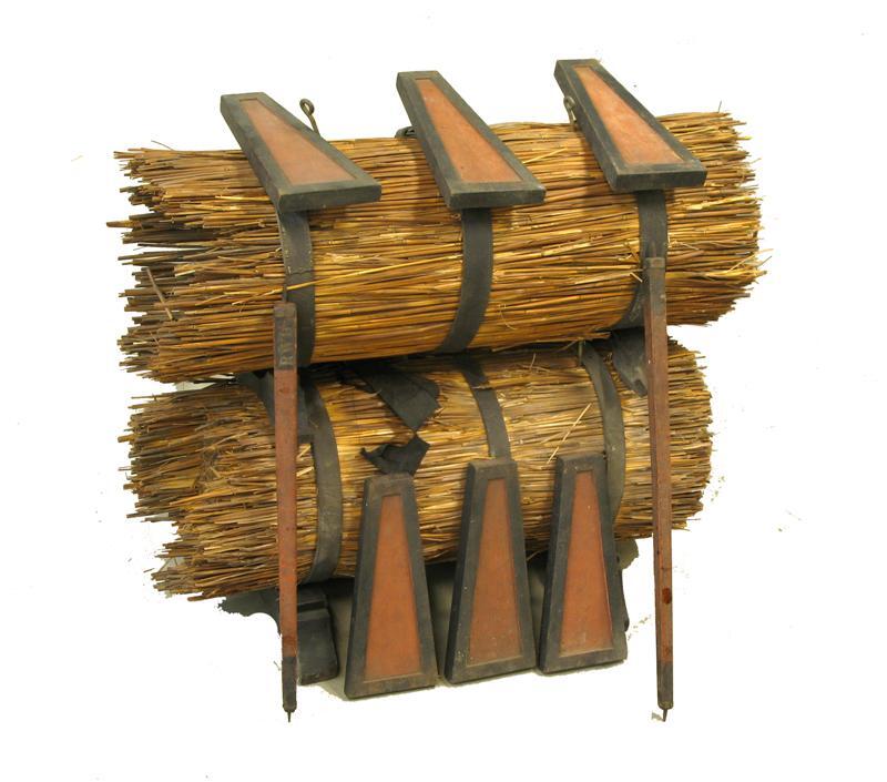 Drie rouwbusseltjes. Een rouwbussel bestaat uit twee rollen stro met een aantal plankjes.