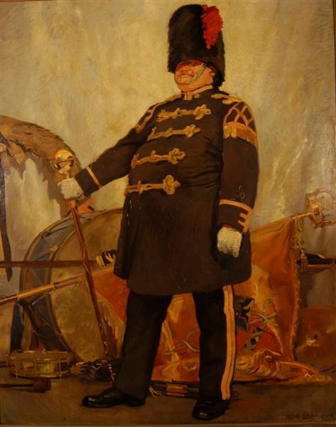 - BeschrijvingTambour-maitre steunend op zijn grote tambour met glimmende knop. Hij draagt een donker uniform met beremuts. Aan de linkerzijde de overwinningskrans.