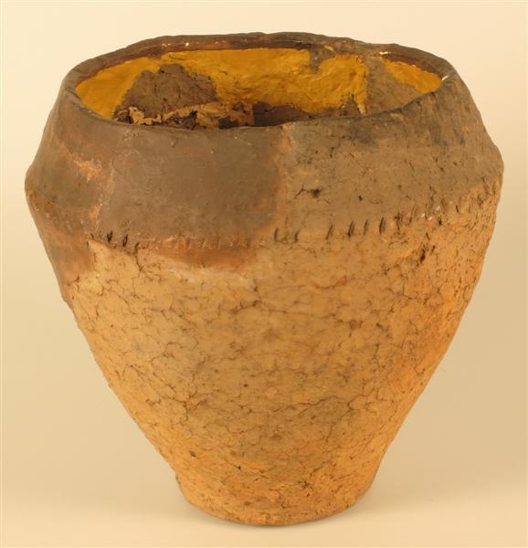- BeschrijvingGrote urn van geel-rood-bruine aarde. Op overgang van buik en hals een krans van vingertopindrukken. Urn rust op een standvoet. Inhoud: 2 scherven