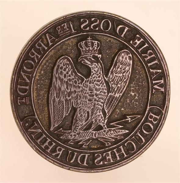 Rond koperen inktstempel met daarop de afbeelding van de Franse keizerlijke adelaar, met bliksemschicht op tak, gekroond. Op de achterzijde een ronde koperen huls waar een handvat in bevestigd heeft gezeten. Randschrift: MAIRE D'OSS 1er ARRONDt (BOUCHES DU RHIN.) Op de achterzijde een ronde koperen huls waar een handvat in bevestigd heeft gezeten.
