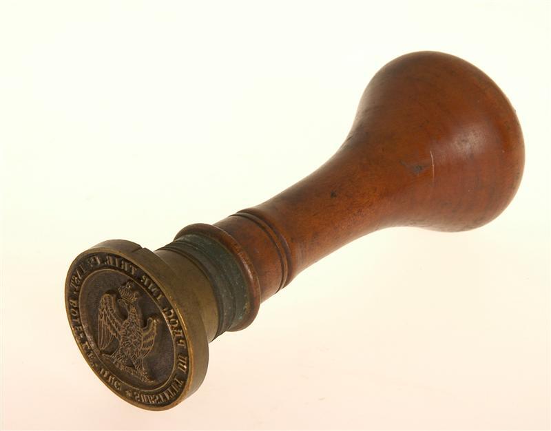 - BeschrijvingRond koperen inktstempel, voorstelling: gekroonde adelaar op tak. Franse keizerlijke adelaar. Op de achterzijde, in een ronde koperen huls in een houten handvat bevestigd. Gebruikt rond 1810-1813. Randschrift: SUBSTITUT DU PROC. IMP. TRIB. Ire. INST. BOIS-LE-DUC * Type als 01287.