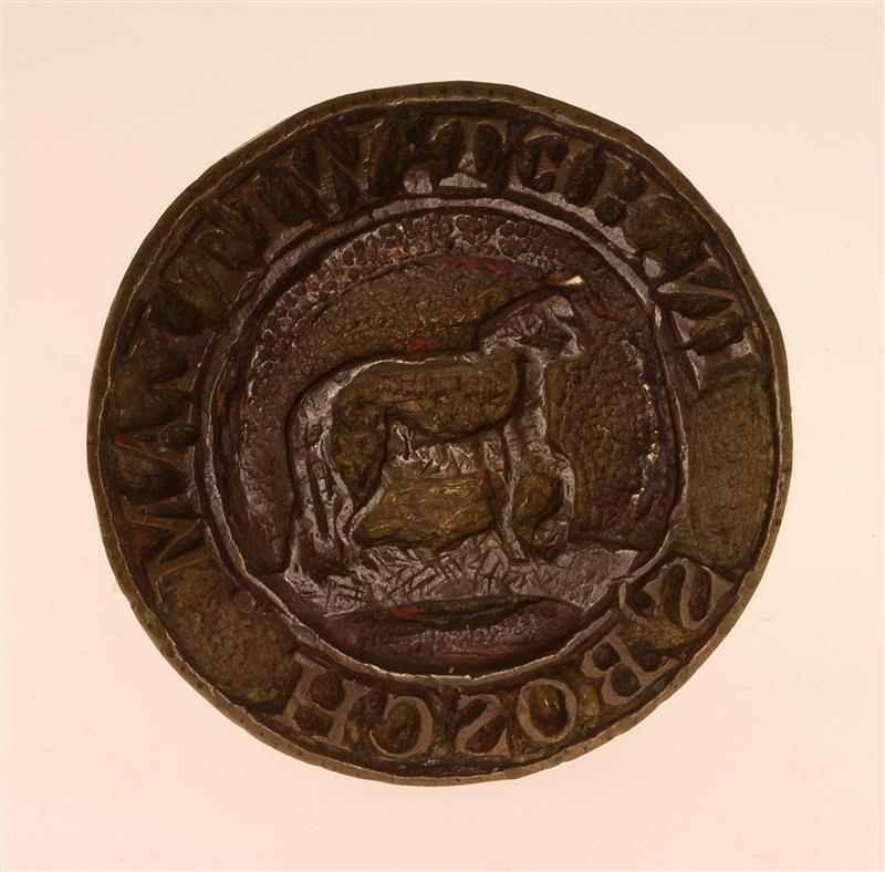 - BeschrijvingRond koperen inktstempel met daarop de afbeelding van een lam. Op de achterzijde zit een ronde koperen huls waar een handvat in bevestigd heeft gezeten. In de mus.doc. is een lijst te vinden met de panden die de naam 'Witlam' droegen. Randschrift: IN . HET . WITLAM . S.BOSCH