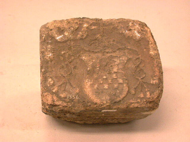 - BeschrijvingWapenschild van de Luikse bisschop Everardus van der Marck (1505-1538) onder onduidelijke ornamenten en geflankeerd door afhangende koorden. Zeer smalle rand (voor zover überhaupt aanwezig). (Op de steen is abusievelijk inv.nr. 1556 geschreven.) Luiks type.