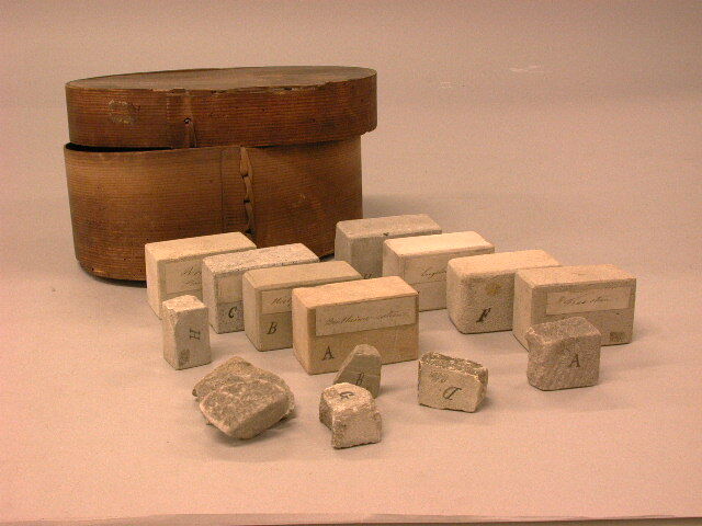 Ovale doos met acht rechthoekige natuursteen blokjes, 4 x 5 x 8 cm, en acht bijbehorende scherven, allen genummerd A-H. Toegevoegd een brief met verklaring en uitleg over de toepassing van de steen aan de Sint-Jan te 's-Hertogenbosch t.b.v. de restauratie. De steensoorten: A: Bentheimer zandsteen; B: Udelfanger zandsteen; C: Trachiet; D: Rochefort kalksteen; E: Trastuf; F: Nievelsteiner zandsteen; G: Portlandsteen; H: Avesnes hardsteen. (Brief in documentatie)