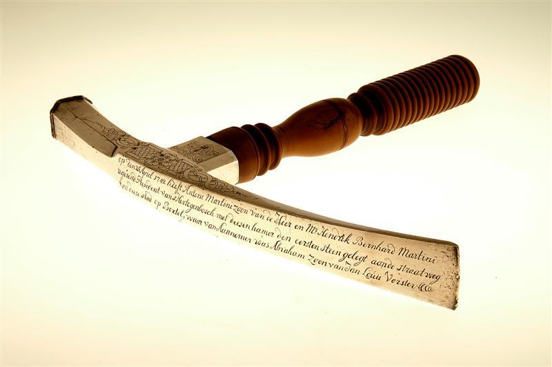 Zilveren hamer met houten handvat. Op bovenzijde de gegraveerde inscriptie: " op den 26 April 1742 heeft Antoni Martini zoon van de Heer en Mr Hendrik Bernhard Martini regerend President van 's Hertogenbosch met deesen hamer den eersten steen gelegt aan de straatweg van deese stad op Boxtel waar van Aannemer was Abraham zoon van Jan Louis Verster" Zijkanten van de hamer versierd met ornamentale Lodewijk XIV graveringen. Houten ronde handvat geleed door meerdere insnoeringen.