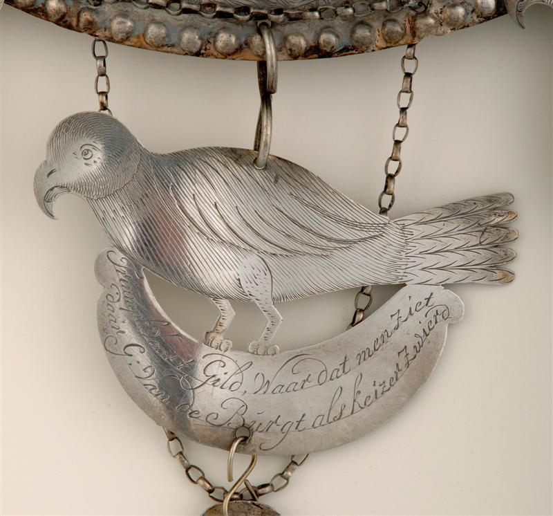 - BeschrijvingGegraveerde platte, links gewende vogel staande op een brede band waarop inschrift: "Triumph Voor 't Gild, Waar dat met Ziet/ daar G:Van de Burgt als keizer Zwierd". Midden boven en -onder een gat i.v.m. de bevestiging (aan het halsschild en koningsschild).