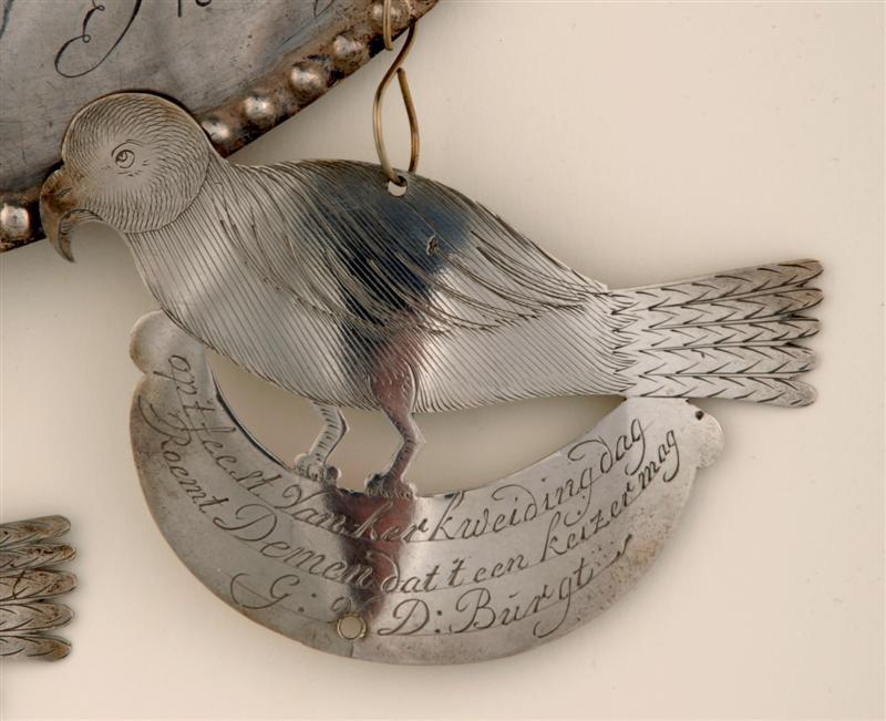 - BeschrijvingGegraveerde platte, linksgewende vogel, staande op een brede band, waarop inschrift: "Op 't feest Van kerkweidingdag/Roemt Demen dat 't een keizer mag/G:V:D:Burgt". Midden boven en onder een gat i.v.m. de bevestiging (aan het halsschild en koningsschild).