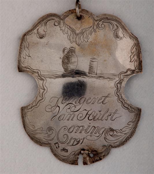Schild met afbeelding van een kan en een glas. Daaronder inschrift: "Jan geret/Van Hulst/Coning 1797" Gegraveerde bladvormige decoratie volgt contour van het schild. Schild heeft onregelmatige contouren. Langs de rand gegraveerde decoratie met lofwerk. Midden boven één en midden onder twee gaten i.v.m. de bevestiging.