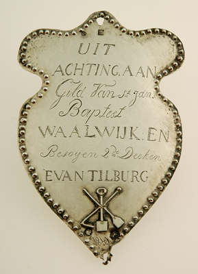 - BeschrijvingSchild met inschrift: "UIT/ACHTING.AAN/Gild Van St Jan/Baptest/WAALWIJK:EN/Besoijen 2de Deeken/ E.VAN TILBURG/1841" Daaronder: 3 gegoten gereedschappen (spade, schep en zeis). Langs de rand gedreven parelrand. Midden boven en onder een gat i.v.m. de bevestiging.