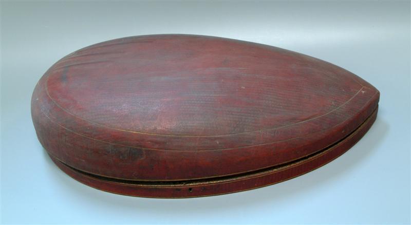 Druppelvormige houten etui met bollende deksel en slot. Buitenzijde bekleed met goud gestempeld rood marokijn. Rood fluwelen bekleding goeddeels verdwenen. In de bodem een briefje geplakt met volgende tekst: Ludovikus Wilhelmus van den Bosch / derde en Zevende Koning der handboogschutterij/in de sositeit de Unie te s Bosch/ Joh. Theod. Luyckx Przd. der schutterij./ L.F. Wartenberg Prezed. der Sositeit de Unie/ J.F. rooderkerke Secretaris/ in Komissie na Zijne Majesteit onzen/ geeerbiedigde Koning Willem 2.