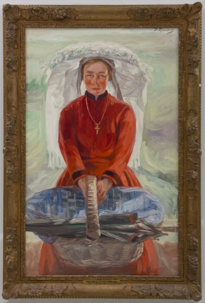 - BeschrijvingTegen een licht fond een portret van een jonge boerin, gekleed in een rode jurk met een witte poffer. Zij houdt een mand voor zich .