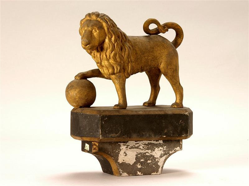 - BeschrijvingVaandelstokbekroning van houtsnijwerk. Op een zeskantig zwart geschilderd houten voetstuk met vergulde randen een vergulde gaande leeuw met de rechter voorpoot op een vergulde kogel.