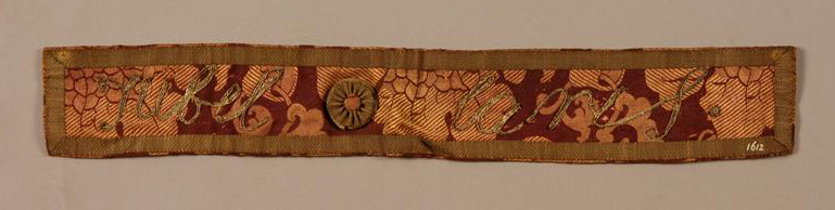 Band van zijden damast met bloemmotief in de kleuren roserood en donkerrood. Langs de randen afgezet met goudband. Het woord "Jubellaris." is met goudband opgenaaid. Tussen "Jubel" en "laris" een dubbele roset van goudband met knoop van bovengenoemde zijde. Gevoerd met rose glanzende katoen. Aan één korte zijde een metalen haakje. Op 5,5 cm afstand van de andere korte zijde een lusje van rose zijden band.
