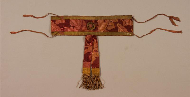 Band van zijden damast met bloemmotief in de kleuren roserood en donkerrood. Langs de (lange) boven- en onderzijde goudband. In het midden een roset van goudband en een knoop van rode zijde. De band wordt gesloten door 2 maal 2 donkerrose zijden bandjes, aan de linkerzijde van de voorkant genaaid en aan de rechterzijde op de voering. Knoop in bovenste rechterbandje. Knoop op roset van zijden damast (als van band).