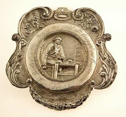 Schild van het St.Crispinus en St.-Crispinianus-gilde te Kaatsheuvel. Cartouchevormig schild met een rand van krullen, bloem- en rankwerk en een guirlande onderaan. In het midden binnen een brede rand waarop een rand met bladmotieven is bevestigd, een voorstelling in reliƫf van een schoenmaker in zijn werkplaats. Op de brede rand het gegraveerde omschrift: "L. Borsten eerste Koning der gilde St Cripijn en Crispinianus/ Kaatsheuvel/ 18 10/9 53". Aan de achterzijde is bovenaan een plaatje met een gaatje gemonteerd.