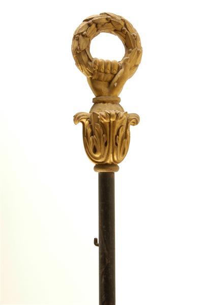 - BeschrijvingZwarte stok met vergulde houten bekroning: uit 4 acanthus-bladeren komt een hand omhoog, een lauwerkrans houdend. Op 48 cm van bovenkant metalen haak.