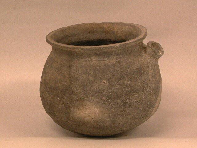 - BeschrijvingPot van grauwe aarde en onverglaasd van onderen geheel kogelvormig, zonder enig spoor van poot of rand boven aan de schuin toelopende hals is een eenvoudige rand om de opening, met platte gegroefde ribbel om de mond en daaronder een doorboord oor of uitgietgat.