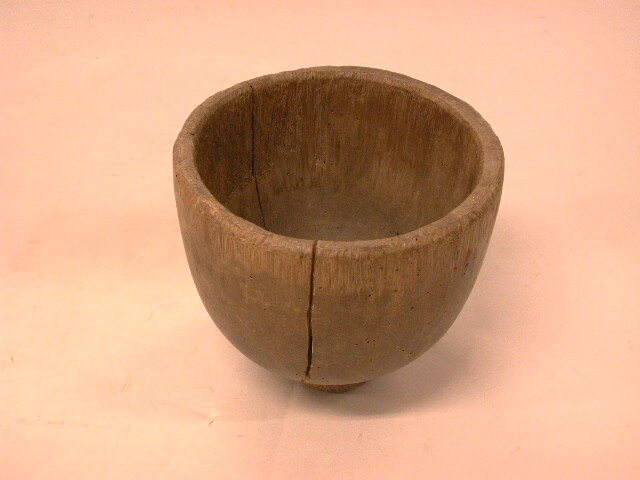 Houten botermaat. Dikwandige kom op een voet die tevens dienst als handvat. Inhoudsmaat: 4 pond boter.
