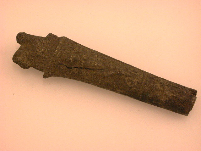 Meshelft met op de top een ruiter, aan de ene zijde een lopende man met hoed, aan de andere zijde 2 lopende figuren.