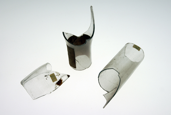 - BeschrijvingFragment 1: stuk van de hoge cylinder Fragment 2: stukje van de onderrand Op fragment 1 een onleesbaar oud etiket Toestand eerder in 1970 geconstateerd.