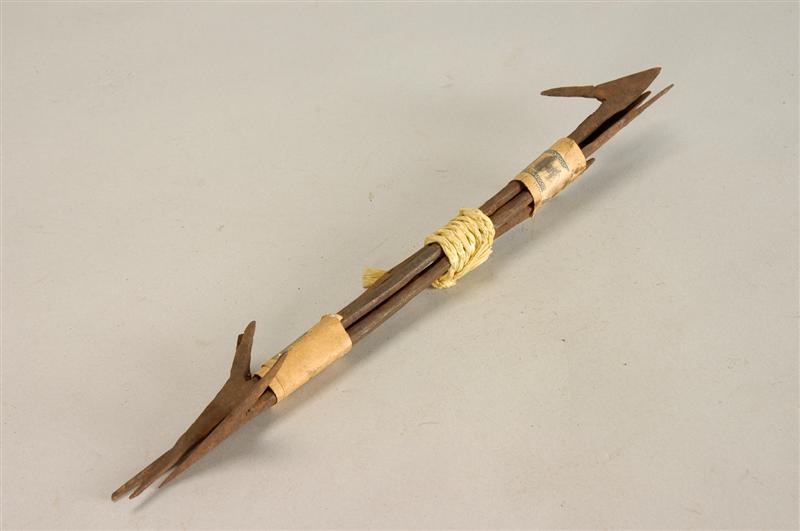 Staafvormig stuk ijzer met punt en weerhaak aan beide zijden, de ene punt scherper dan de ander.