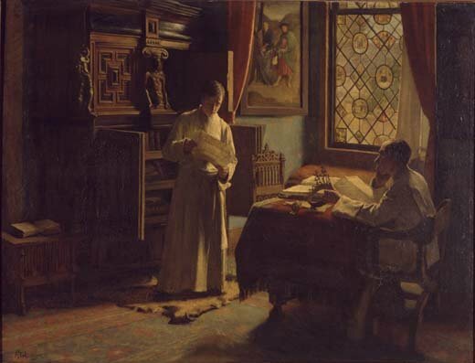 - BeschrijvingTwee monniken, geestelijken van de orde der Norbertijnen of Premonstratenzers in de "ridderzaal" van kasteel Heeswijk.