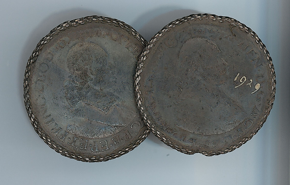 Stel broeksknopen vervaardigd uit twee Luikse kronen, geslagen onder bisschop Maximiliaan Hendrik van Beieren (1650-1688). De munten zijn aan de keerzijde verbonden door een schakel.
