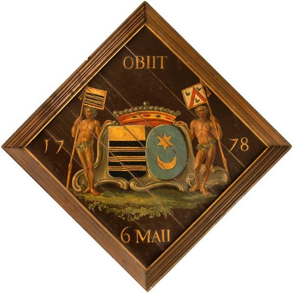 Diagonaal hangend vierkant bord in zwarte lijst met verguldsel. Op het bord, tegen een zwarte achtergrond, de alliantiewapens Van Thulden-Du Jardin onder een (graven-?)kroon en tussen twee staande wildemannen met rechthoekig vaandel. Linker wapen: golven van goud op veld van zwart (=Van Thulden) Linker vaandel: idem. Rechter wapen: ovalen veld van blauw met een ster en wassenaar van goud (= Du Jardin). Rechter vaandel: keper van rood, vergezeld van drie merletten van zwart op een veld van zilver. Tekst: Obiit/6Maii/1778. (=Rouwbord Joseph Emmanuel Francois van Thulden, Hr. v. Overminde, geb. Mechelen 24-12-1725, of zijn vrouw, Lucretia Du Jardin, geh. 21-9-1748).