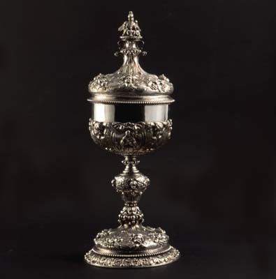 Zilveren ciborie, Lodewijk XIV-decoratie met reliëfdecor van engelenkopjes, waartussen vruchtenguirlandes en vogels. Op cuppa reliëfdecor met 4 Jezuïtische heiligen binnen 4 cartouches. Op ronde, gewelfde voet een reliëf banddecor met acanthusbladeren. Deksel bekroond door pelikaan met 3 jongen. De 4 heiligen: - St. Franciscus Borgia, gekroonde schedel en monstrans. - St. Ignatius Loyola, zegelboek en IHS - St. Aloysius Gonzaga, crucifix en boom - St. Franciscus Xaverius, palmtak
