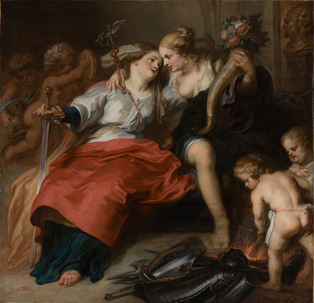 Allegorische voorstelling van twee vrouwenfiguren omgeven door engeltjes, die Rechtvaardigheid en Overvloed personificeren.