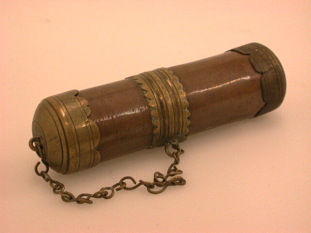 - BeschrijvingCylindrische, roodkoperen tondeldoos met geelkoperen dekseltje, geelkoperen verschuifbare bodem en geelkoperen band rond het midden. De van bodem naar deksel lopende ketting is van de bodem afgescheurd en aan de middenband vastgesoldeerd. De tondel (zwarte stof) is nog aanwezig.