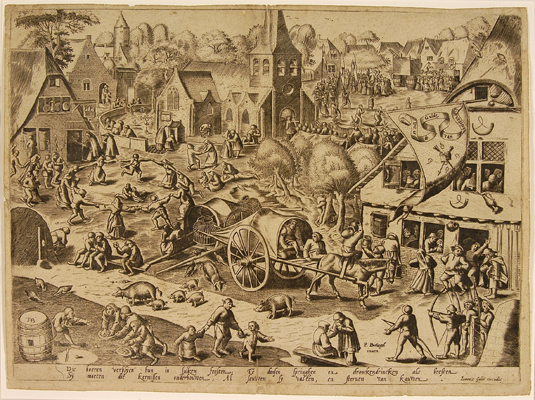 - BeschrijvingOpschrift: "Dit is de Gulde van hoboken" Onderschrift: "Die boeren verblijen hun in sulken feesten, Te dansen springhen en droncken drincken als beesten./ Sij moeten die kermissen onderhouwen, al suwen sij vasten, en steruen van kauwen."