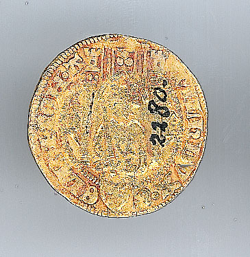 Keerzijde: tronende vorst onder gotisch baldakijn, middenonder een schild met een klimmende leeuw. Voorstelling oversnijdt aan boven- en onderzijde een parelrand. Met omschrift.