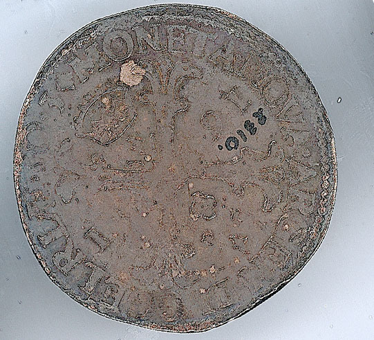 Voorzijde: een stammenkruis met een vuurstaal waaruit vonken springen. Boven het vuurstaal een kroon, met een omschrift waarin een herkruist kruis. Naast het stammenkruis het jaartal 1591.